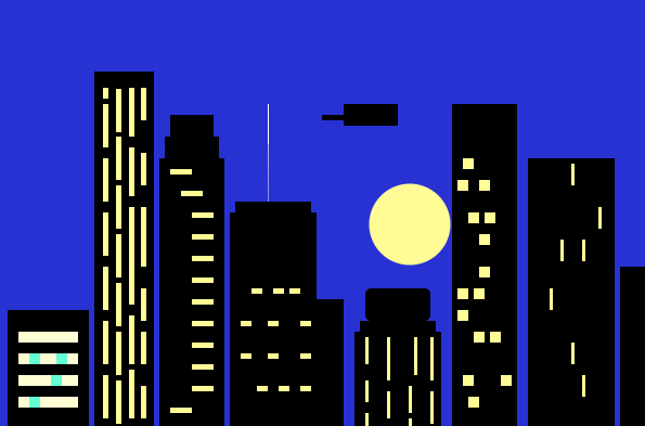 A city skyline built with p5.js shapes and loops, brought to life with animations and sound-reactive elements.